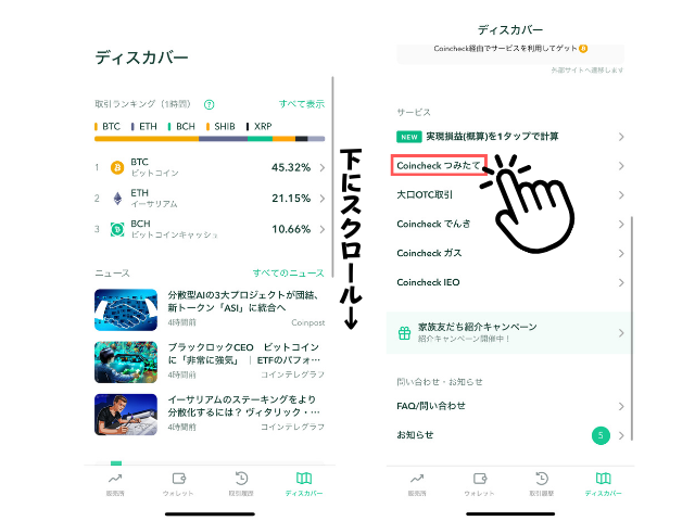 1.アプリを起動し、画面右下の「ディスカバー」→「Coincheckつみたて」をタップ。